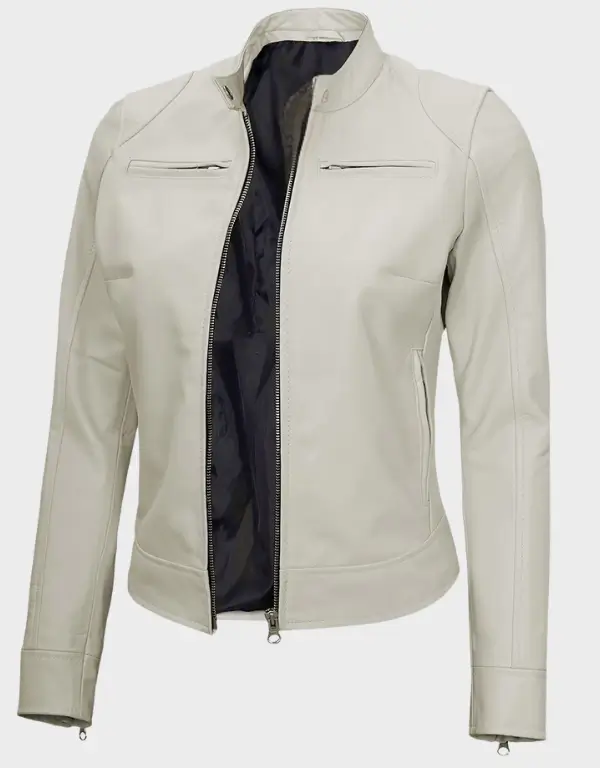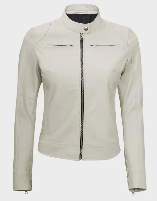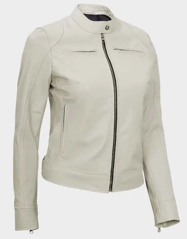 Off White Leather Cafe Racer Jacket for Women